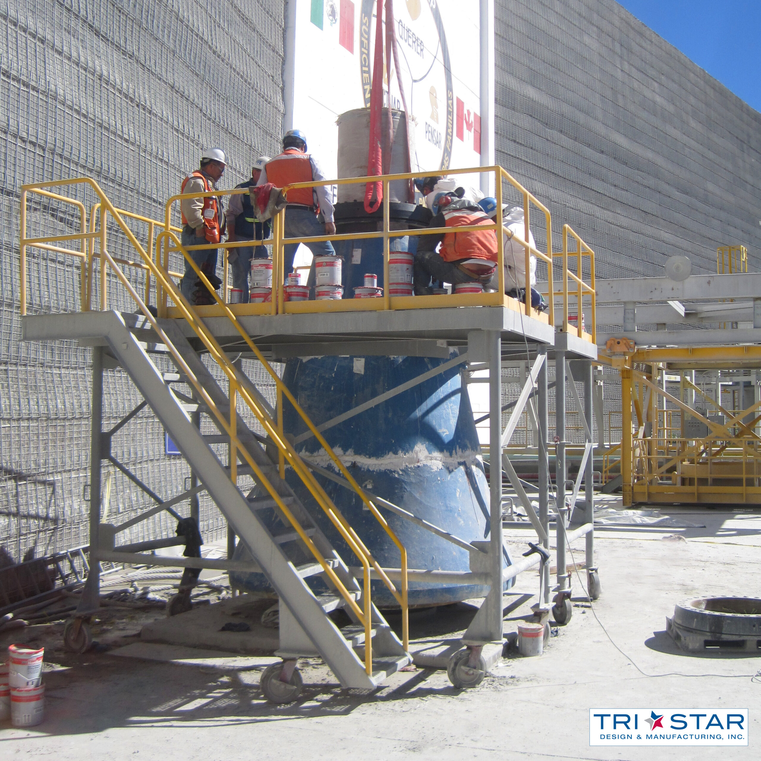 Our generous size work deck allows the entire crew to efficiently perform their work functions. The convenient height of the work deck and hand rail system eliminate ladders and fall risks normally associated with this type of work. This rolling structure wraps around your mainshaft when sitting in a staging pit. The built in staircase allows for safe and easy access to the upper work deck. Provides access to the lower part of the stem for seal maintenance as well as access to the mantle for mantle dressings. Also provides access to the top of the liner and head nut.